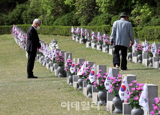 [이데일리 김태형 기자] 4.19혁명 제64주년 기념식이 거행된 19일 서울 강북구 국립4.19민주묘지에서 관계자가 묘역을 참배하고 있다.
