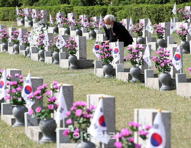 [이데일리 김태형 기자] 4.19혁명 제64주년 기념식이 거행된 19일 서울 강북구 국립 4.19 민주묘지에서 관계자가 묘역을 참배하고 있다.