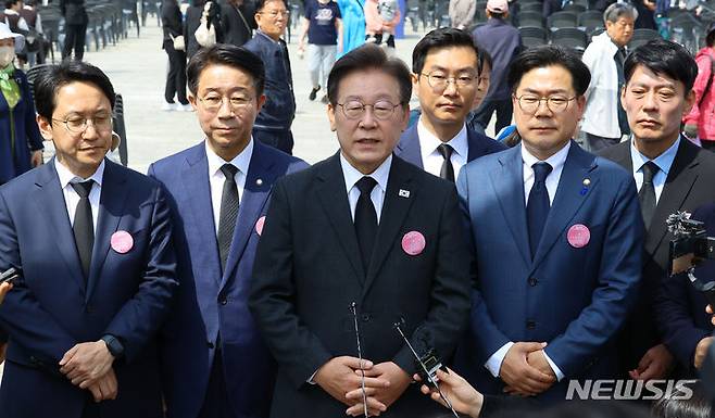 [서울=뉴시스] 최진석 기자 = 이재명 더불어민주당 대표가 19일 서울 강북구 국립4.19민주묘지에서 열린 ‘제64주년 4.19혁명 기념식’ 참석을 마친 후 발언하고 있다. 2024.04.19. myjs@newsis.com