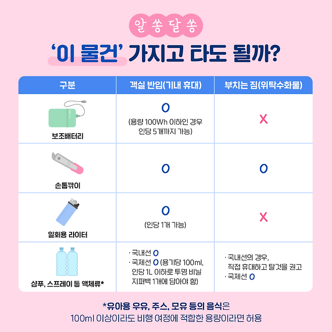 · 국내선 O · 국제선 O(용기당 100ml, 인당 1L 이하로 투명비닐지퍼백 1개에 담아야 함) |