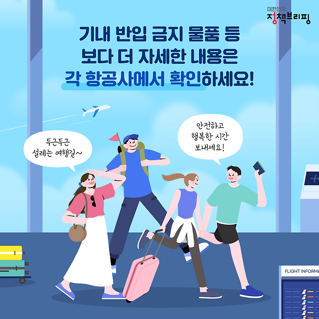 기내 반입 금지 물품 등 보다 더 자세한 내용은 각 항공사에서 확인하고, 두근두근 설레는 여행길 안전하고 행복한 시간 보내세요!