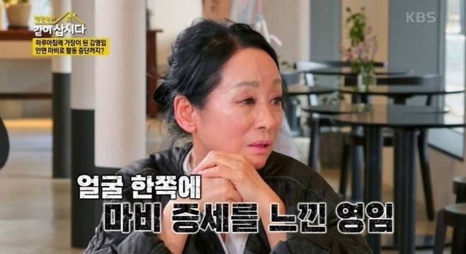 김영임은 "하루는 화장실에 가서 얼굴을 보니 굳어가기 시작했다. 너무 놀랐다"며 "안면 3차 신경마비였다. 한쪽 눈이 감기더라. 그 후로 1년을 쓰러진 채로 살았다"라고 토로했다.