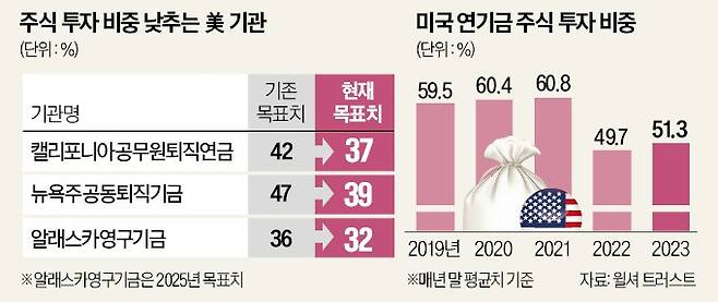 경찰, 소방관 등을 위해 2600억달러의 기금을 운용하고 있는 뉴욕주 공동퇴직기금(NYSCRF)은 최근 포트폴리오(자산 배분)에서 주식의 비중을 47%에서 39%로 줄였다. 주식시장에서 회수한 투자금은 PEF, 부동산 등에 투자할 방침이다. 800억달러 규모인 알래스카영구기금(APFC)도 주식 비중을 줄였다. 2023회계연도 말 기준으로 자산의 36%였던 주식을 2025년까지 32%로 줄일 방침이다. 세 기금 모두 지난해 말 미국 내 연기금 주식 투자 비중 평균치(51.3%)를 밑도는 목표치를 설정했다.