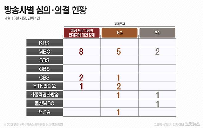 ◆권영철 대기자> 그렇습니다. 22대 국회의원 선거방송심의위원회 15차 회의가 어제(18일) 열렸는데요. 6건의 법정제재 의결이 있었습니다. MBC 뉴스데스크 보도와 관련해 관계자에 대한 징계 1건, 경고 3건, 주의 1건이었고, CBS '김현정의 뉴스쇼'에 대해서도 법정제재 경고가 1건이 있었습니다.
