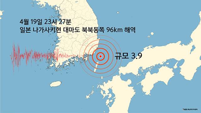 오늘(19일) 밤 11시 27분 일본 나가사키현 대마도 먼 해역에서 규모 3.9의 지진이 발생해 부산과 대구 등에서 지진을 느꼈다는 제보가 KBS에 이어지고 있습니다.