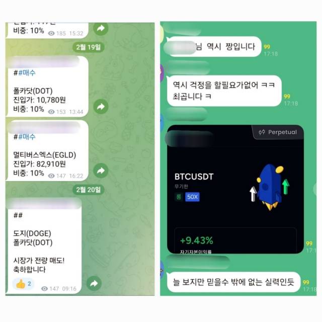 유혹은 계속됐다. 지난달 초 가상자산 가격이 급등하자 3일에 한 번 정도 올라오던 매수 신호의 빈도는 하루 1~2회로 늘었다. 리딩방에 대한 신뢰를 주기 위해 지속적으로 수익을 내주는 전략이다. “중국코인으로 수급 이동이 있을 가능성이 크다”며 향후 가상자산 시장에 대한 전망을 제시하는 등 전문성을 과시하기도 했다.