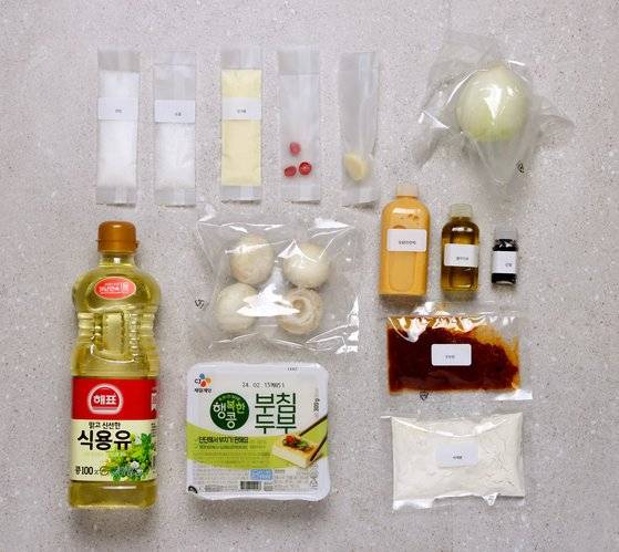 두부마파소스: 두부 30g, 양송이버섯 50g, 양파 120g, 마늘 3g, 홍고추 1g, 두반장 45g, 설탕 10g, 간장 5g, 콩기름