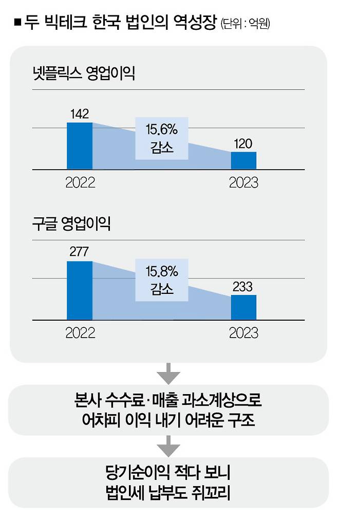 # 넷플릭스와 구글의 영향력은 두말할 필요가 없다. 넷플릭스는 명실상부한 전세계 1위 OTT 플랫폼이다. 구글은 유튜브와 앱마켓, 검색엔진으로 글로벌 시장을 호령하고 있다. 그런데 이들이 한국에서 올린 실적은 엉망이다. 두 회사 한국법인의 2023년 영업이익은 전년 대비 모두 줄었다.