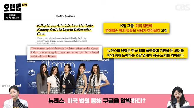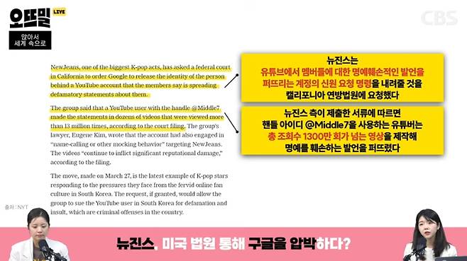 ◆ 박수정> 현지 시각으로 10일, 뉴욕타임스 보도인데요. 기사에 따르면 "K팝의 가장 큰 그룹 중 하나인 뉴진스는 유튜브에서 멤버들에 대한 명예를 훼손하는 발언을 퍼뜨리는 계정에 신원 요청 명령을 구글에 내려줄 것을 캘리포니아 연방 법원에 요청했다"고 합니다. 구글에 알려달라고 하면 안 알려주니까 구글 본사가 있는 캘리포니아의 법원에 직접 요청을 한 거예요. 법원이 구글을 압박해달라는 거죠.
