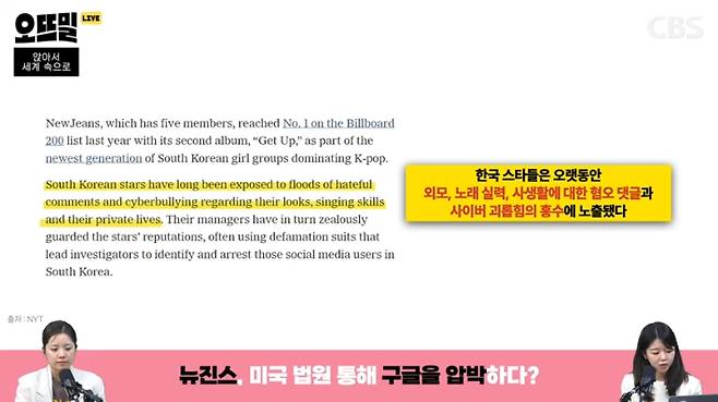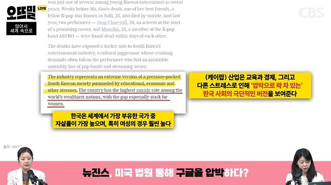 ◆ 박수정> 해당 기사에서 좀 와닿았던 관점이, 타인에 대한 압박을 주고 평가하는 한국 특유의 문화가 집약된 산업이 바로 케이팝 산업이라는 시각이었는데요. 기사를 인용해보면, 'K팝 산업은 교육과 경제, 그리고 다른 스트레스로 인해서 압박으로 가득 차 있는 한국 사회의 극단적인 버전이라고 생각하면 된다'고 쓰여있어요. 전 세계에서 가장 부유한 국가들 중에 자살률이 가장 높은 한국 사회는 특히 젊은 여성의 경우에 훨씬 더 그 비율이 높아진다는 점을 지적을 합니다. 이렇게 서로 평가하고 압박을 주는 문화가 극대화돼서 케이팝 업계에 사이버 불링이 되었다고 분석을 하고요. 그런 측면에서 이번 뉴진스의 구글 정보 공개 요청 사건이 그동안 이런 고질적인 문화에 경종을 울릴 수 있는 사건이 아닐까 생각됩니다.