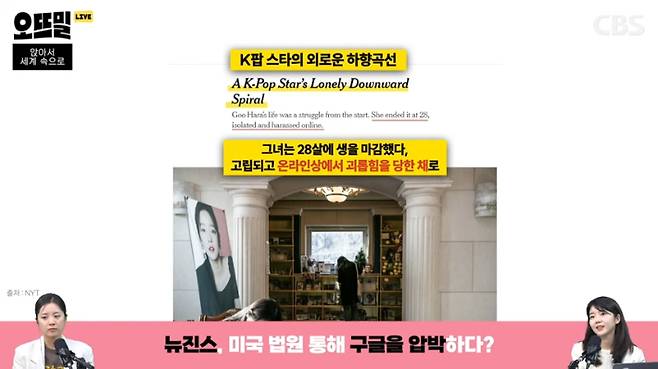 ◆ 박수정> 뉴욕타임스는 지속해서 K팝 업계의 어린 아티스트들이 이렇게 정신적으로 혹사당하면서 일하는 상황에 대해서 계속 보도를 하고 목소리를 내고 있습니다. 올해 2월 말에는 이런 기사가 났어요. 'K-pop 스타의 외로운 하향 곡선'이라는 제목의 기사인데요. 케이팝 아이돌이 어두운 길로 떨어지는 상황을 조명한 기사인데 이 기사에서 그룹 카라의 멤버였던 고 구하라 씨의 인생을 다루거든요. 기사에서는 구하라 씨가 28살에 생을 마감했다면서, 그전에 고립되고 온라인상에서 괴롭힘을 당했다고 묘사돼 있습니다. 최근 몇 년 사이에 스스로 목숨을 끊은 케이팝 아티스트들이 많았잖아요. 그런 현상의 원인으로 이 고질적인 온라인상의 괴롭힘 그리고 대중들이 주는 압박감을 지적하기도 했어요.