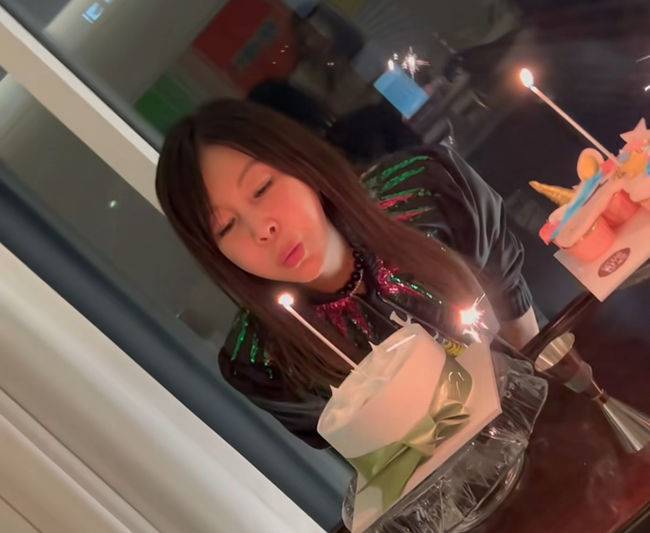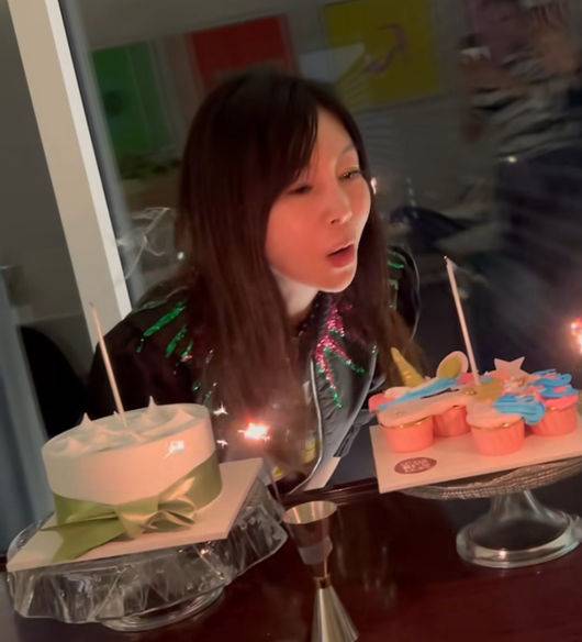 황신혜는 축하와 환호를 받으며 케이크마다 붙은 화려한 촛불을 불어 없앴다.