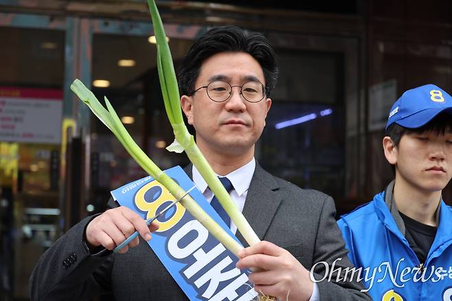 | ▲ 대구 수성구을 선거구에 출마한 오준호 새진보연합 후보가 5일 수성구 동아백화점 수성점 앞에서 기자회견을 열고 대파를 가위로 자르는 퍼포먼스를 진행하고 있다. |