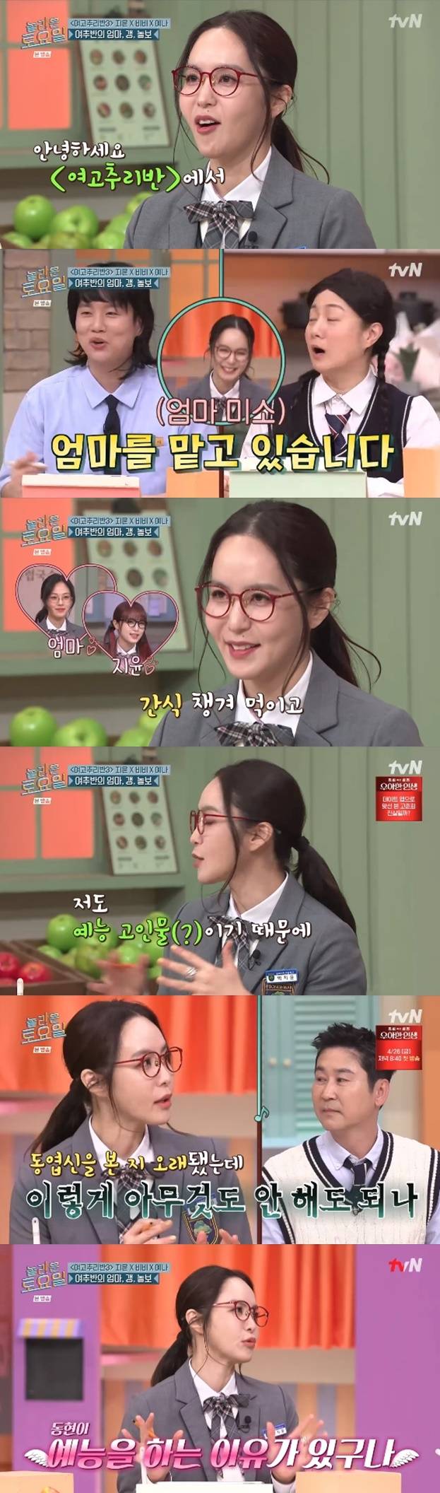박지윤은 "'여고추리반'에서 엄마를 맡고 있다. 애들이 준비물 못 챙기면 챙기고 간식 챙겨 먹이고 그러고 있다"라며 엄마 미소를 지었다.