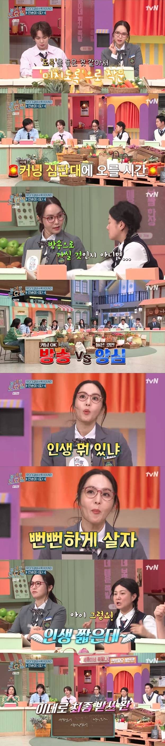 박나래는 "방송으로 갈 거냐, 양심으로 갈 거냐"라고 물었다. 박지윤은 "인생 뭐 있냐 뻔뻔하게 살자. 인생 짧은데"라며 받쓰 커닝을 하겠다고 밝혔다.