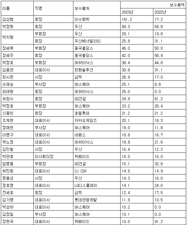 한편 김상범 이수그룹 회장은 지난해 1천73억원의 적자를 기록한 계열사 이수화학의 미등기 임원에서 퇴임하면서 퇴직금 138억3천100만원과 급여 및 상여금을 합쳐 161억2천300만원을 받았다. 이 금액은 2022년 이수화학의 흑자 금액(155억원)보다도 많은 수준이다.