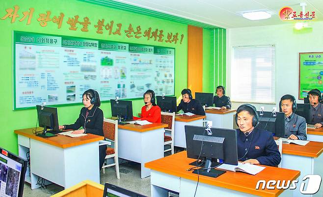 (평양 노동신문=뉴스1) = 북한 노동당 기관지 노동신문은 21일 일꾼들의 과학기술 습득 및 활용을 강조했다. 사진은 강원도 양묘장 일꾼들이 과학기술보급실을 이용하는 모습.