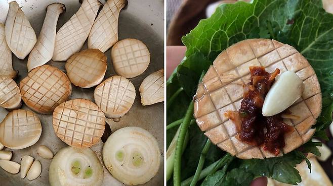 그때 버섯이 맛있다는 것을 처음 알았다. 이렇게 맛있는데 하나만 먹는다는 게 아쉬울 정도로 맛있었다. 비건식을 하면서 깨달은 것은 감질나게 곁들이던 버섯을 고기의 자리에 두고 양껏 구워 먹는 일이 가능하다는 사실! 이제는 양송이, 새송이, 표고 가릴 것 없이 먹고 싶을 만큼 구워 먹는다. 버섯마다 각각의 풍미와 식감을 발견하는 것은 또 다른 재미다.