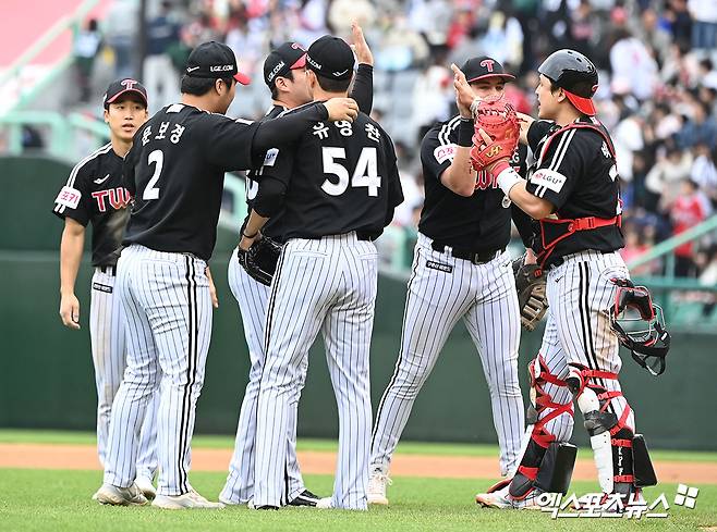 이날 경기에서 승리한 LG 선수들이 기뻐하고 있다.