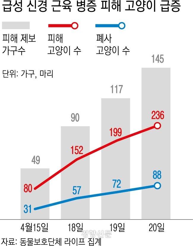 지난 20일 기준 동물보호단체 라이프가 접수한 반려묘 피해 사례는 총 236마리로 이 중 88마리가 죽었다. 이 고양이들은 모두 특정 제조원에서 2024년 1~4월 만든 사료를 먹은 것으로 조사됐다. 심인섭 라이프 대표는 “전국적으로 고양이의 연령이나 품종과 무관한 피해가 나타났으며 현재까지 확인된 공통점은 사료 이외는 없다”고 밝혔다.