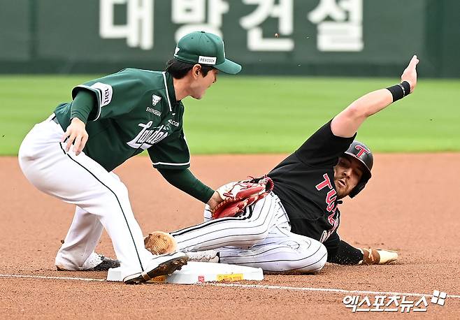 (엑스포츠뉴스 인천, 김한준 기자) 21일 오후 인천SSG랜더스필드에서 열린 '2024 신한 SOL Bank KBO리그' LG 트윈스와 SSG 랜더스의 더블헤더 2차전 경기, 1회초 2사 1,2루 LG 오스틴이 문보경의 좌전안타때 3루에서 세이프되자 SSG가 비디오판독을 신청했다.