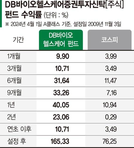 21일 금융투자업계에 따르면 DB자산운용이 운용하는 DB바이오헬스케어 펀드는 A클래스 기준 1년 수익률(1일 기준)이 40.05%다. 기간별 수익률은 1개월 9.90%, 3개월 10.71%, 6개월 31.64%, 9개월 33.26%, 2년 23.06%, 연초 이후 10.71%, 설정(2009년 11월 3일) 이후 165.33%에 달했다.