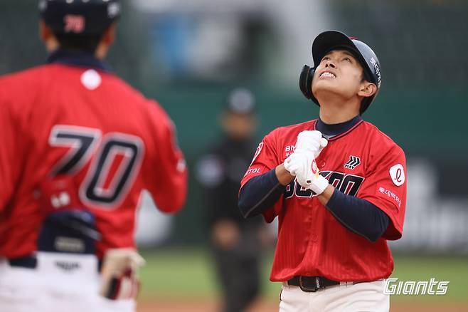 황성빈은 빅터 레이예스 타석에서 도루에 성공하며 엄상백을 흔들었고, 타자는 3구째 체인지업을 공략해 우측 담장을 넘기는 투런홈런을 쳤다. 스코어 3-0.