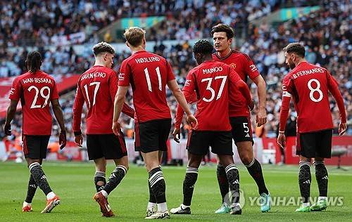 epa11292101 Manchester United players celebrate after Bruno Fernandes (R) scored the 3-0 lead during the FA Cup semi-final soccer match Coventry City against Manchester United at Wembley in London, Britain, 21 April 2024. EPA/ANDY RAIN EDITORIAL USE ONLY. No use with unauthorized audio, video, data, fixture lists, club/league logos, 'live' services or NFTs. Online in-match use limited to 120 images, no video emulation. No use in betting, games or single club/league/player publications.