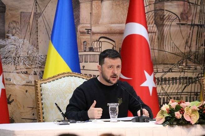 [볼로디미르 젤렌스키 우크라이나 대통령이 현지시간 8일 튀르키예를 방문해 레제프 타이이프 에르도안 대통령과 돌마바흐체 궁전 대통령 집무실에서 정상회담한 후 기자회견을 열고 있다.(이스탄불=연합뉴스)]