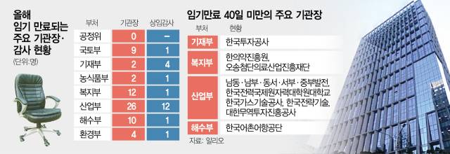21일 서울경제신문이 8개 경제 부처의 공공기관 경영정보 공개시스템(알리오)을 분석한 결과 공기업, 준정부기관, 기타 공공기관 142곳 중 13곳의 기관장 임기가 이달 혹은 다음 달 종료된다. 이미 임기가 종료됐거나 공석인 곳도 22곳에 달한다.