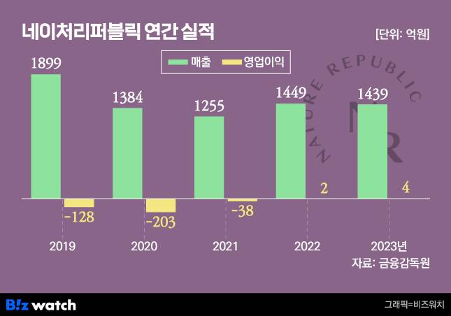 반등의 기미가 보이기 시작한 것은 2022년이다. 네이처리퍼블릭의 2022년 매출액은 1449억원으로 전년보다 15.4% 성장했다. 특히 2억원의 영업이익을 내며 흑자 전환에도 성공했다. 지난해 네이처리퍼블릭의 매출액은 전년과 비교해 소폭 감소한 1439억원이었으나, 영업이익이 88.1% 늘어난 4억원을 기록하며 수익성을 개선했다.
