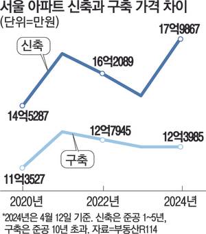 하지만 최근 신축 선호 현상이 강해지면서 올해(4월 12일 기준)는 5억5800만원으로 크게 벌어졌다. 서울 신축 아파트가 지난해 15억100만원에서 올해 17억9000만원으로 뛰는 사이 구축 아파트는 12억4100만원에서 12억3900만원 오르는 데 그치면서 신축과 구축 간 격차가 켜졌다. 부동산R114 관계자는 “지난해부터 분양가 상승이 본격화하고 공사비가 급증하면서 현재 가장 최신상인 신축 아파트가 관심을 받고 있다”고 전했다.