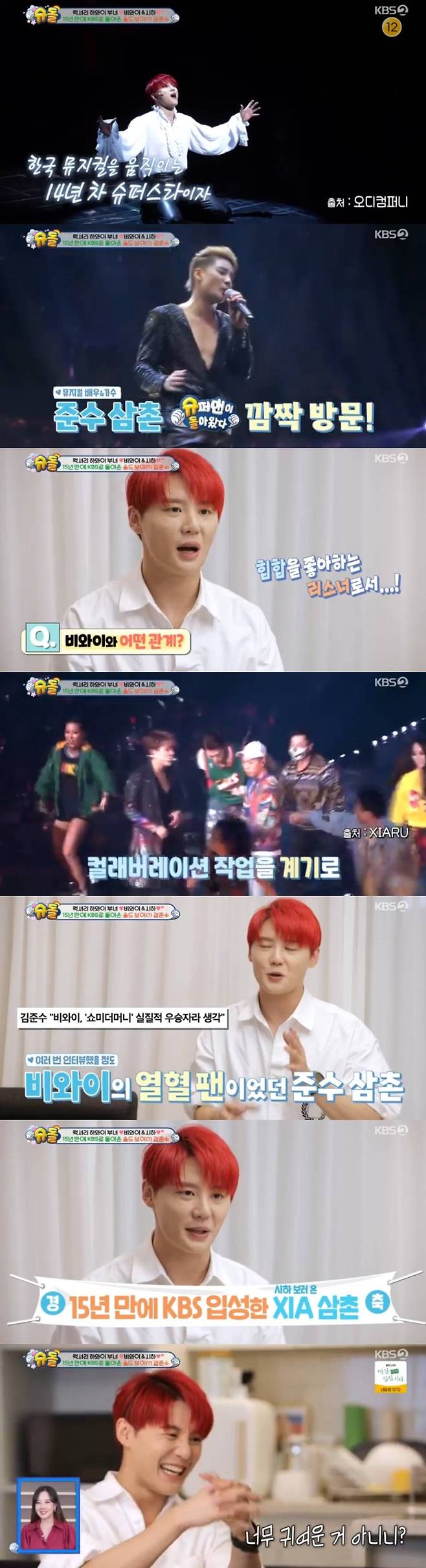 이날 김준수는 비와이 집들이에 온 이유에 대해 "힙합을 좋아하는 리스너로서 이렇게 잘하는 한국 래퍼를 본적이 없다 싶었다. 개인적으로 팬이었는데 피쳐링으로 작업을 하고 나서 이번에 이사도 했고, 시하도 볼겸 겸사겸사 왔다"고 전했다.