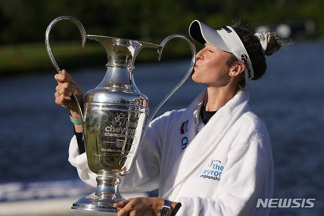[우들랜즈=AP/뉴시스] 넬리 코르다(미국)가 21일(현지시각) 미 텍사스주 더 우들랜즈의 더 클럽 칼턴 우즈에서 열린 미국여자프로골프(LPGA) 투어 셰브런 챔피언십 정상에 올라 트로피를 들고 입 맞추고 있다. 코르다는 최종 합계 13언더파 275타로 우승하며 5경기 연속 우승 기록을 썼다. 2024.04.22.