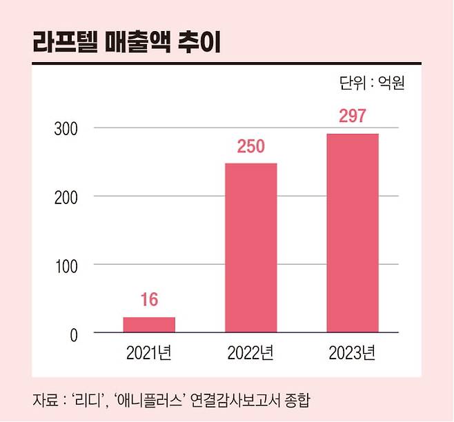 지난 3월 21일 공시된 애니플러스(라프텔 최대주주) 사업보고서에 따르면 지난해 라프텔 매출액은 297억원으로 전기 42억원에서 대폭 증가했다. 당기손익도 동기간 4억9000만원에서 24억원으로 늘었다. 2022년 연간 매출 250억원을 달성하고 영업이익을 흑자로 전환한데 이어 2년째다.