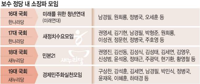 보수 진영에서는 한나라당(국민의힘 전신) 시절부터 초·재선 의원 또는 쇄신파로 구성된 의원 모임이 등장했다. 16대 국회에서는 당시 30∼40대였던 ‘남·원·정’(남경필, 원희룡, 정병국 전 의원)이 ‘미래를 위한 청년연대(미래연대)’를 이끌며 이회창 총재의 제왕적 리더십을 비판하는 등 당내 개혁적인 목소리를 주도했다. 17대 국회에서는 ‘남·원·정’을 비롯해 권영세, 김기현, 주호영 의원 등이 활동한 ‘새정치수요모임’이 미래연대를 계승했다. 이어 새누리당 시절인 18대 국회에서는 권영진, 김선동, 김성태, 김세연, 김영우, 박민식, 신성범, 황영철 전 의원 등 개혁 성향이 주도한 ‘민본21’, 19대 국회 당시에는 강석훈, 김세연, 이혜훈 등 ‘경제통’ 등이 참여한 경제민주화실천모임이 당의 혁신을 이끌었다는 평가를 받는다.