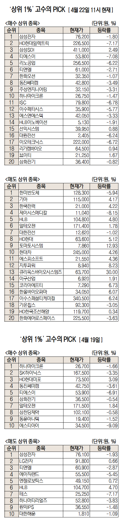 미래에셋증권은 자사 고객 중에서 지난 1개월간 수익률 상위 1% 투자자들의 매매 종목을 집계해 실시간·전일·최근 5일 기준으로 모바일트레이딩시스템(MTS)상에서 공개하고 있다. 이 통계 데이터는 미래에셋증권의 의견과 무관한 단순 정보 안내이며 각각의 투자자 개인에게 맞는 투자 또는 수익 달성을 보장하지 않는다. 또 테마주 관련종목은 이상 급등락 가능성이 있으므로 유의해야 한다.