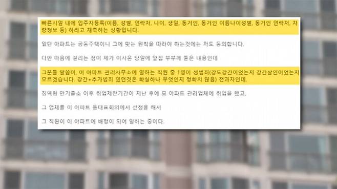 최근 한 온라인 커뮤니티에는 아파트 관리사무소 직원이 성범죄자여서 입주 등록하기가 망설여진다는 한 입주민의 사연이 전해졌습니다.