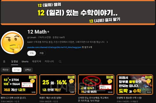 1위를 차지한 '12 Math'는 구독자 21만 명, 누적 조회 수 1500만 회를 보유한 채널이다. 미국 프린스턴대 박사 출신 '일희쌤'(본명 김일희)이 운영하는 이 채널은 개설 6개월여 만에 구독자 10만 명을 달성하고 지난달 20만 명의 고지마저 넘어서며 빠르게 성장 중이다. 일상생활에서 유용한 계산 요령을 알려주는 '계산 테크닉', 수학의 기초 개념을 일반인도 알기 쉽게 설명해주는 '수학 개념 이야기', 세계적으로 유명한 수학 난제들을 풀이해주는 '흥미로운 문제' 등 다채로운 콘텐츠를 제공한다. 최고 인기 영상 "제곱 계산 1초 만에 하는 법", "퍼센트 계산 1초 만에 하는 법" 등은 각각 200만 회 이상 높은 조회 수를 올리고 있다.