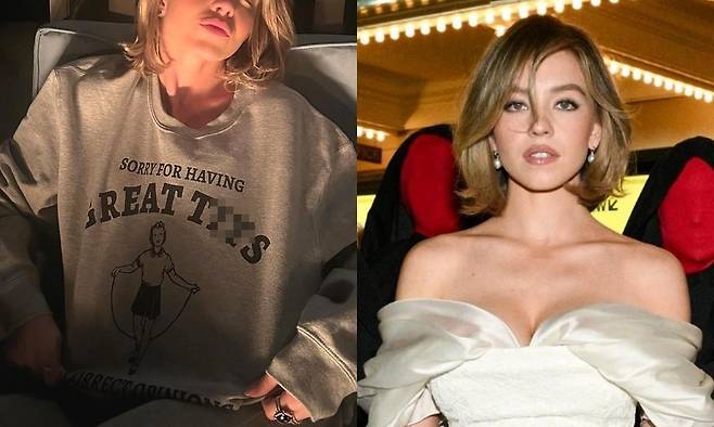 해당 사진 속 그는 "내 가슴이 커서 미안"이라고 인쇄되어 있는 회색 맨투맨을 입고 있다. 시드니 스위니는 글씨가 제대로 보이게끔 맨투맨을 잡고 밑으로 당기고 있다.