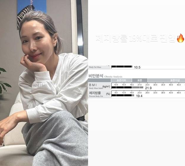 신봉선 역시 눈물 없인 볼 수 없는 다이어트로 전성기 미모를 뽐내고 있다. 최근 그는 SNS를 통해 "체지방률 19%대로 진입했다"고 알리며 BMI(체질량 지수)와 체지방률 검사지를 공개했다. 검사지에는 체지방률 표준치를 간신히 넘긴 19.4%로 표시돼 눈길을 끌었다.
