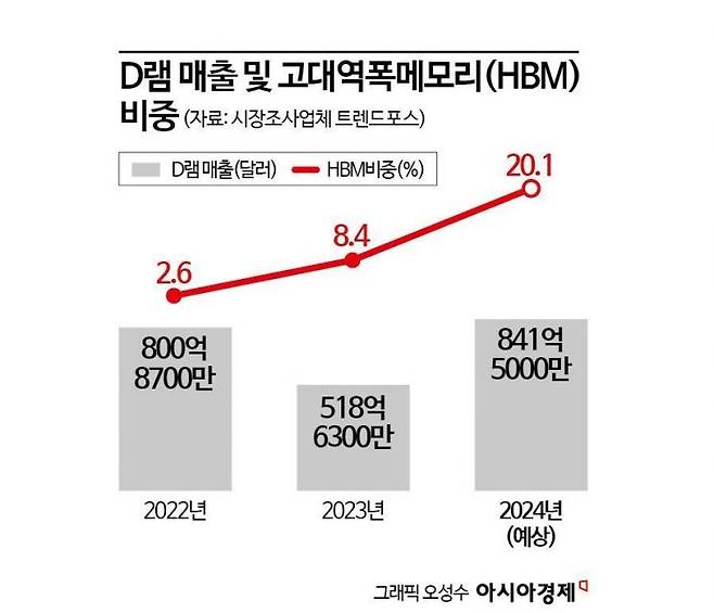 딜로이트그룹은 최근 보고서를 통해 올해 전체 반도체 시장(5760억달러)에서 AI 반도체 비중이 11%에 이를 것으로 내다봤다. 특히 생성형 AI 반도체 시장 규모는 올해 500억달러 이상에서 2027년 1100억~4000억달러에 이를 수 있다고 전망했다. HBM 시장 역시 몸집을 키울 전망이다. 트렌드포스는 올해 D램 시장 규모가 841억5000만달러에 이를 것이라며 이 중 HBM 점유율은 20.1%로 지난해(8.4%) 대비 두 배 넘게 뛸 수 있다고 봤다.