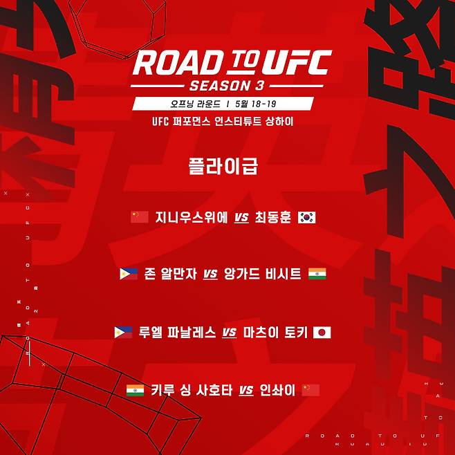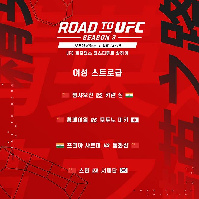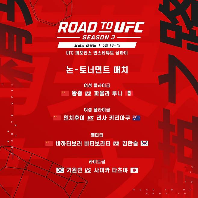 로드 투 UFC 시즌 3 오프닝 라운드는 UFC PI 상하이에서 유관중으로 진행된다.