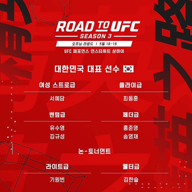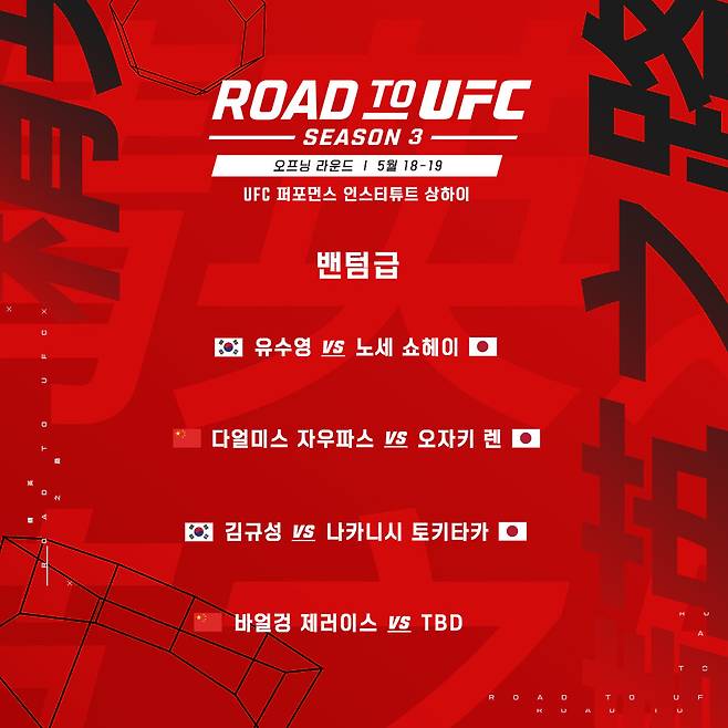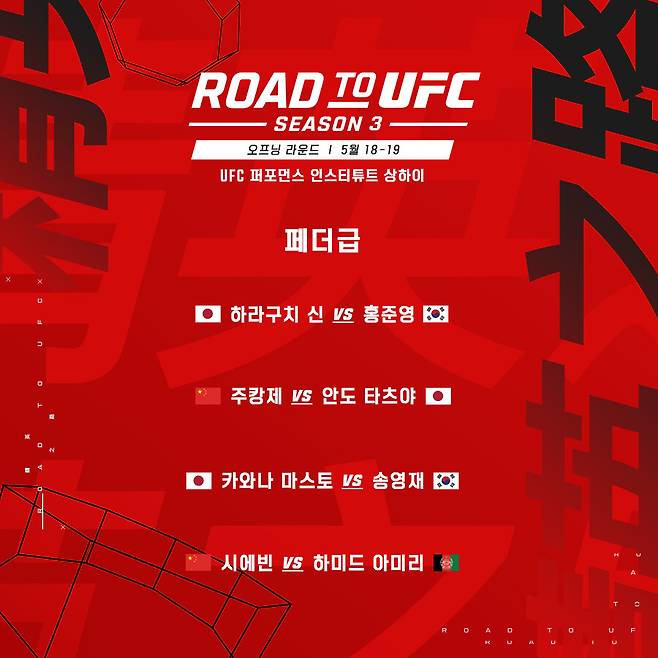 UFC가 아시아 정상급 유망주들이 세계 무대로 진출할 수 있는 등용문 로드 투 UFC(ROAD TO UFC) 세 번째 시즌을 발표했다.