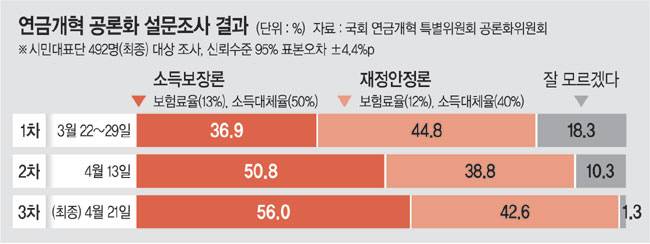 23일 국회와 정부 등에 따르면 국회 연금개혁특별위원회 산하 공론화위원회는 ‘소득보장론’이 ‘재정안정론’보다 더 높은 지지를 받았다는 내용의 시민 대표단 설문조사 결과를 전날 내놓았다. 공론화위는 보험료율(내는 돈)을 현행 9%에서 13%로 올리고 소득대체율(평균소득 대비 받게 될 연금액)은 현행 40%에서 50%로 높이는 1안, 보험료율을 12%로 올리고 받는 돈은 그대로 유지하는 2안을 선택지로 제시했다. 그 결과 응답자 492명 중 56.0%가 1안을 택했다.