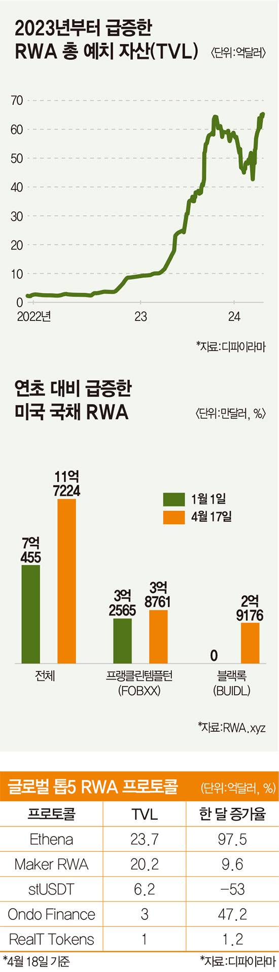 최근 RWA에 관심이 집중된 건 세계 최대 자산운용사 블랙록 영향도 크다. 올해 3월 말 미국 증권거래위원회(SEC)에 RWA 테마에 투자하는 펀드 신청서를 제출했다. 미국 국채 등에 투자하는 토큰화 펀드로 매달 배당금을 토큰 형태로 지급하도록 설계됐다.