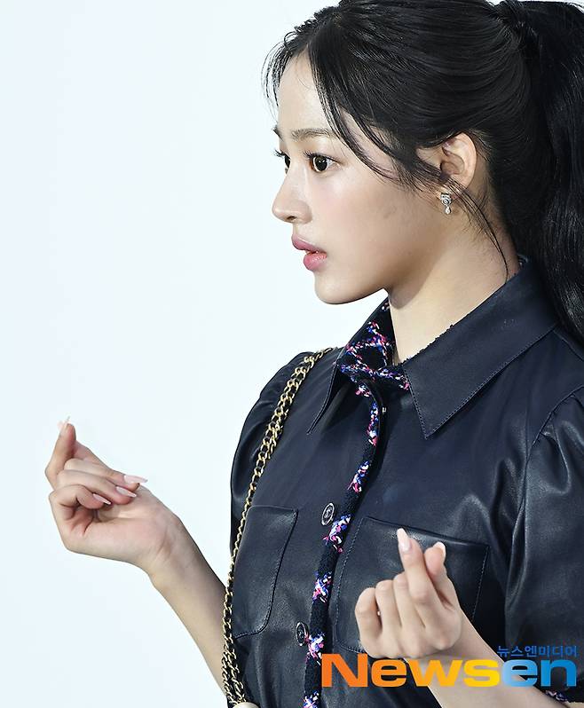 뉴진스 민지가 4월 23일 오후 서울 성동구에서 열린 한 포토월에서 포즈를 취하고 있다.