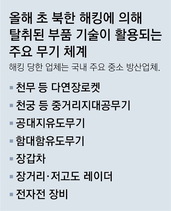 북한이 해킹한 업체는 군 주요 무기체계에 사용되는 케이블 등을 국내 대형 방산업체 등에 납품하는 곳이다. 대표적인 국산 무기인 다연장로켓 ‘천무’, 중거리지대공미사일 ‘천궁’ 등에도 이 업체의 부품이 사용되고 있다.