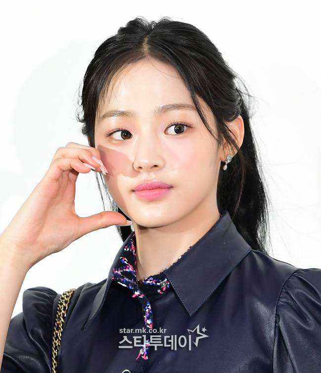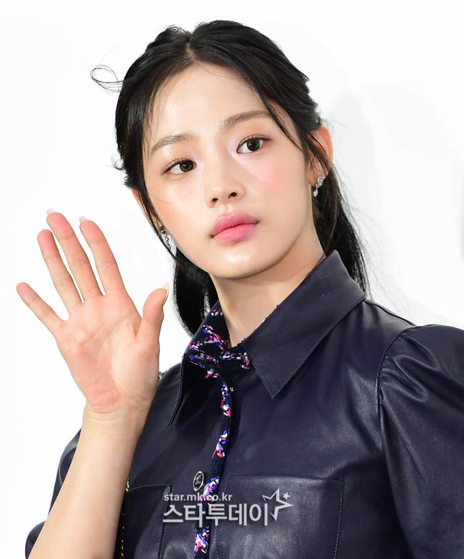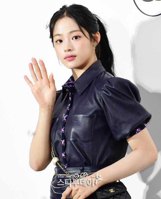 블랙의 심플한 샤넬 의상과 포니테일 헤어로 취재진과 팬들 앞에 나선 그룹 뉴진스 민지는 손인사와 손하트 등 포즈 요청에 응하면서도 무거운 분위기로 포토행사를 이어갔다.