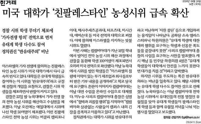 오늘(4.24) 아침신문에 일제히 실린 기사는 △의대 교수들의 ‘주 1회 휴진’ 논의(6곳)입니다. 정부 압박 수위를 높이고 있습니다. 또 △야당의 민주유공자법·가맹사업법 직회부 요구 의결(4곳)을 1면에 다룬 곳도 많았습니다.